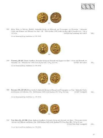 3 6* vasu deva ii., 267-300. Dinar, Mathura/Gandhara. Stehender König mit Dreizack vor Altar / Thronende Göttin