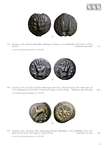 374* Quadrans ca. 240 v. Chr., Rom. Hand, links 3 Wertkugeln / 2 Körner. Cr. 14, 4; Haeberlin, Tf. 40, ; Syd. 11. 91,1 g;